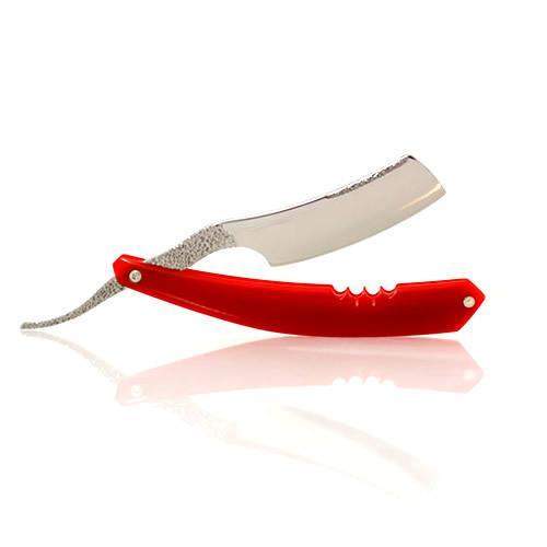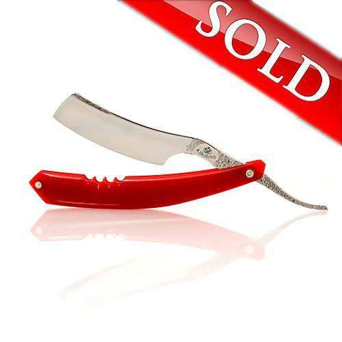 * O1 tool steel hardened to HRC 60 giving a long-lasting edge that isn't impossible to hone. * 7/8" wide blade. * 100% hand made by Alex Jacques. * organic flowing blade shape with a smiling edge. * Intricate hand applied stippling all over the spine and tang. * Stamped maker's mark. * Red G10 scales (a high strength fiberglass/epoxy laminate that is impervious to all but the most extreme liquid, chemical, and temperature changes). * New "bracing system" instead of the usual wedge/spacer. Fully functional with a more modern look. Made of brass and stainless steel. * Adjustable stainless steel pivot pins (front and back). * Phosphor-Bronze pivot bearing washers. * Nickel-silver wedge/spacer pin with stainless steel washers. * Shave-ready.