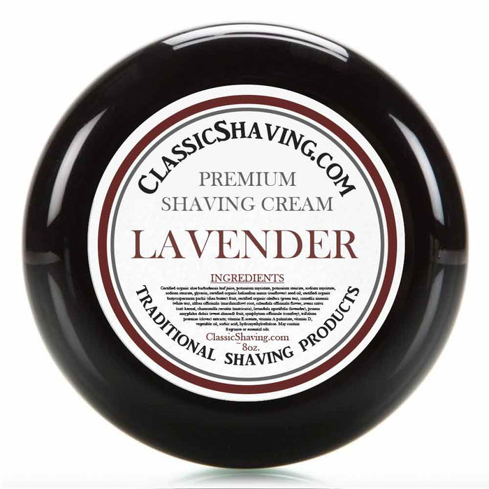Classic Shaving is proud to present its very own, highly researched and long anticipated Lavender shaving cream. Formulated to our specifications with organic compounds, this premium Lavender shave cream produces an explosion of thick creamy lather infused with botanical extracts to soothe and nourish the delicate skin of the face while providing a cushioning of dense lather and lubrication for a close cutting shave.