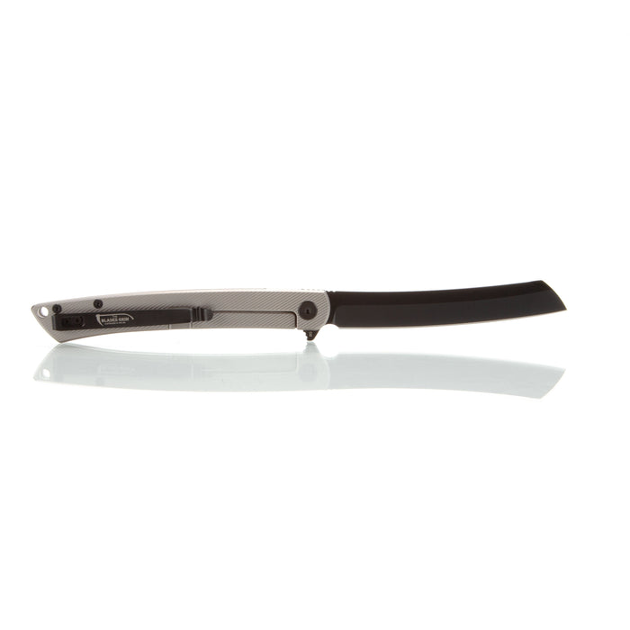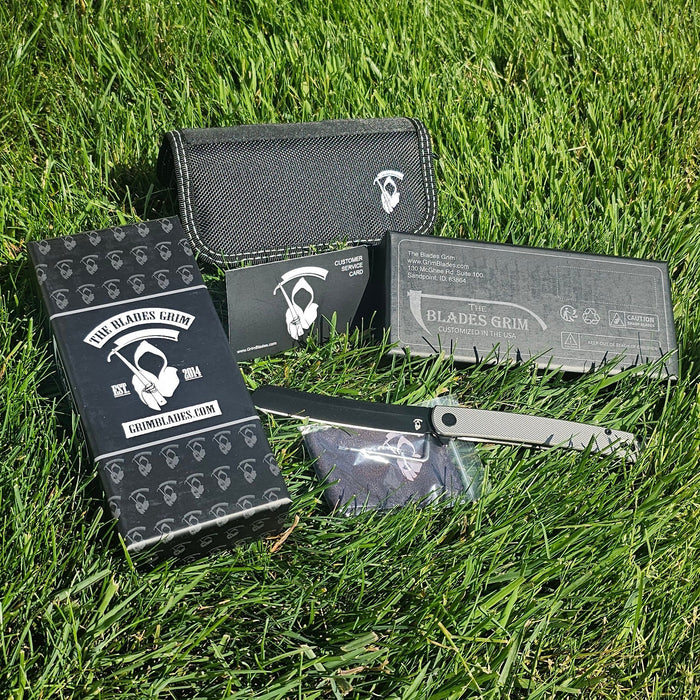 The Grim 50 BFG starts from a high-grade titanium frame locking handle and features a D2 high quality steel blade. This is our flagship folding blade, and we’re confident you’ll love it. Designed at our headquarters in Sandpoint, Idaho, we set out to blend the sleek style of our straight razors into a stunning folding knife. The result? A blade that perfectly captures our vision and craftsmanship.