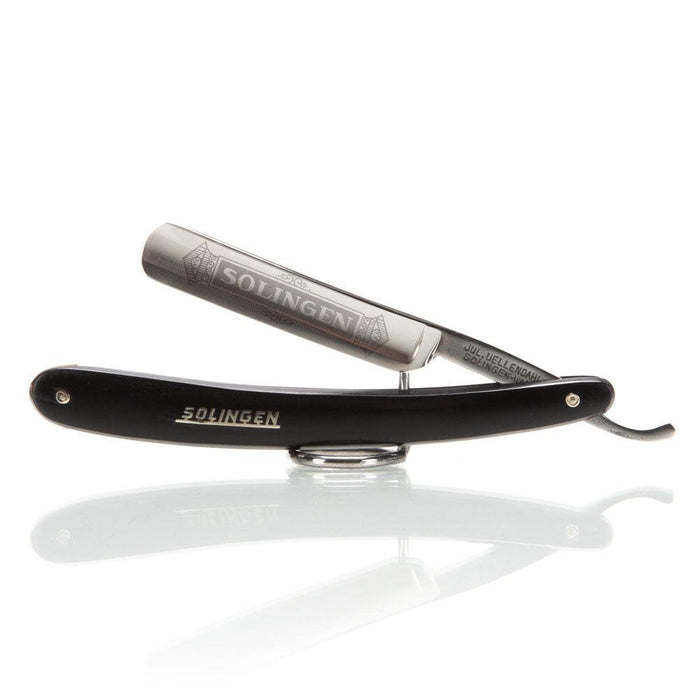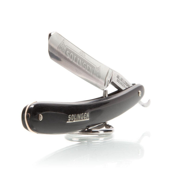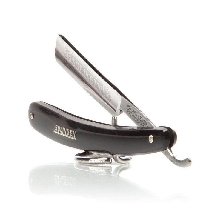 This vintage straight razor is a beauty and a very rare razor to find these days. Black original scales with the "Solingen" logo and the razor itself has a beautiful Solingen engraving that is still in perfect condition.