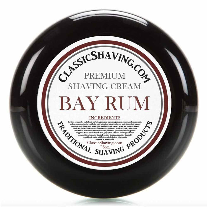 Classic Shaving is proud to present its very own, highly researched and long anticipated Bay Rum shaving cream. Formulated to our specifications with organic compounds, this premium Bay Rum shave cream produces an explosion of thick creamy lather infused with botanical extracts to soothe and nourish the delicate skin of the face while providing a cushioning of dense lather and lubrication for a close cutting shave.