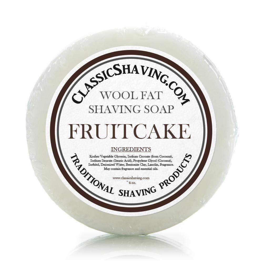We're confident that once you've used "Classic Brand" Fruitcake Wool Fat Shaving Soap you will not want to use any other brand.. We have been dreaming of a Wool Fat Shaving Soap ever since we read of the benefits of lanolin in skin care and we knew our soap maker in beautiful Northern Idaho was up to the challenge. After much research, formula tweaking and testing, they came up with what we feel is a true gem. This soap is rich and it creates a lather, while not fluffy, is quite silky and your razor will glide across it giving you a nourishing and smooth shave. The 3" diameter 4 ounce puck is quite dense and should last longer than an average shaving soap. Available in 32 unique scents.