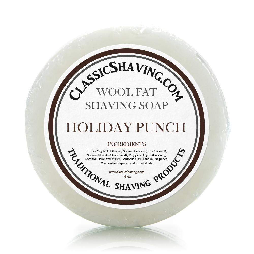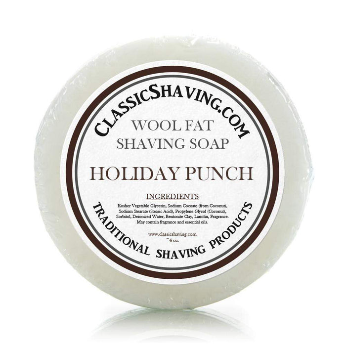 We're confident that once you've used "Classic Brand" Holiday Punch Wool Fat Shaving Soap you will not want to use any other brand. We have been dreaming of a Wool Fat Shaving Soap ever since we read of the benefits of lanolin in skin care and we knew our soap maker in beautiful Northern Idaho was up to the challenge. After much research, formula tweaking and testing, they came up with what we feel is a true gem. This soap is rich and it creates a lather, while not fluffy, is quite silky and your razor will glide across it giving you a nourishing and smooth shave. The 3" diameter 4 ounce puck is quite dense and should last longer than an average shaving soap. Available in 32 unique scents.