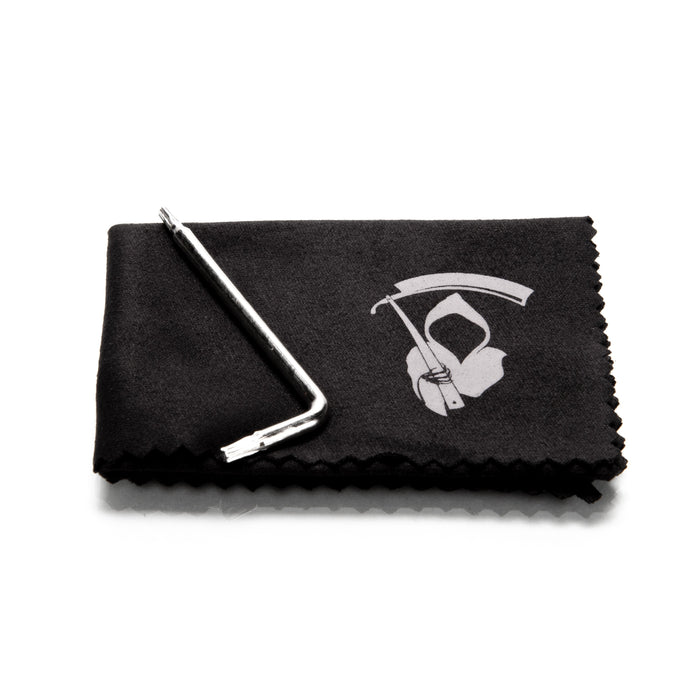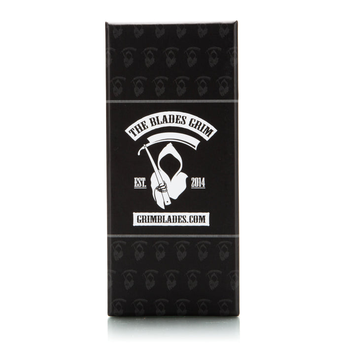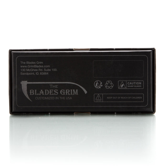 The Grim 338BFG starts from a high-grade steel frame locking handle wrapped in an aggressively etched black carbon fiber, this provides a serious anti-slip handle and is perfect for working in slick environment's. The blade features D2 high quality steel, with a fast sway blade and the Grim Tanto Point. Designed at our headquarters in Sandpoint, Idaho, we set out to blend the sleek style of our straight razors into a stunning folding knife. The result? A blade that perfectly captures our vision and craftsmanship.