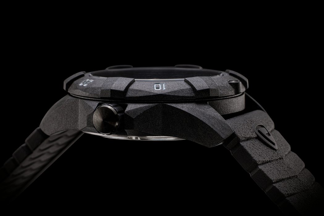 - 42mm Carbon Composite Case and Bezel, with Screw-on Stainless Steel Case Back. Weight: 73.2 grams. Case Thickness: 13.95mm